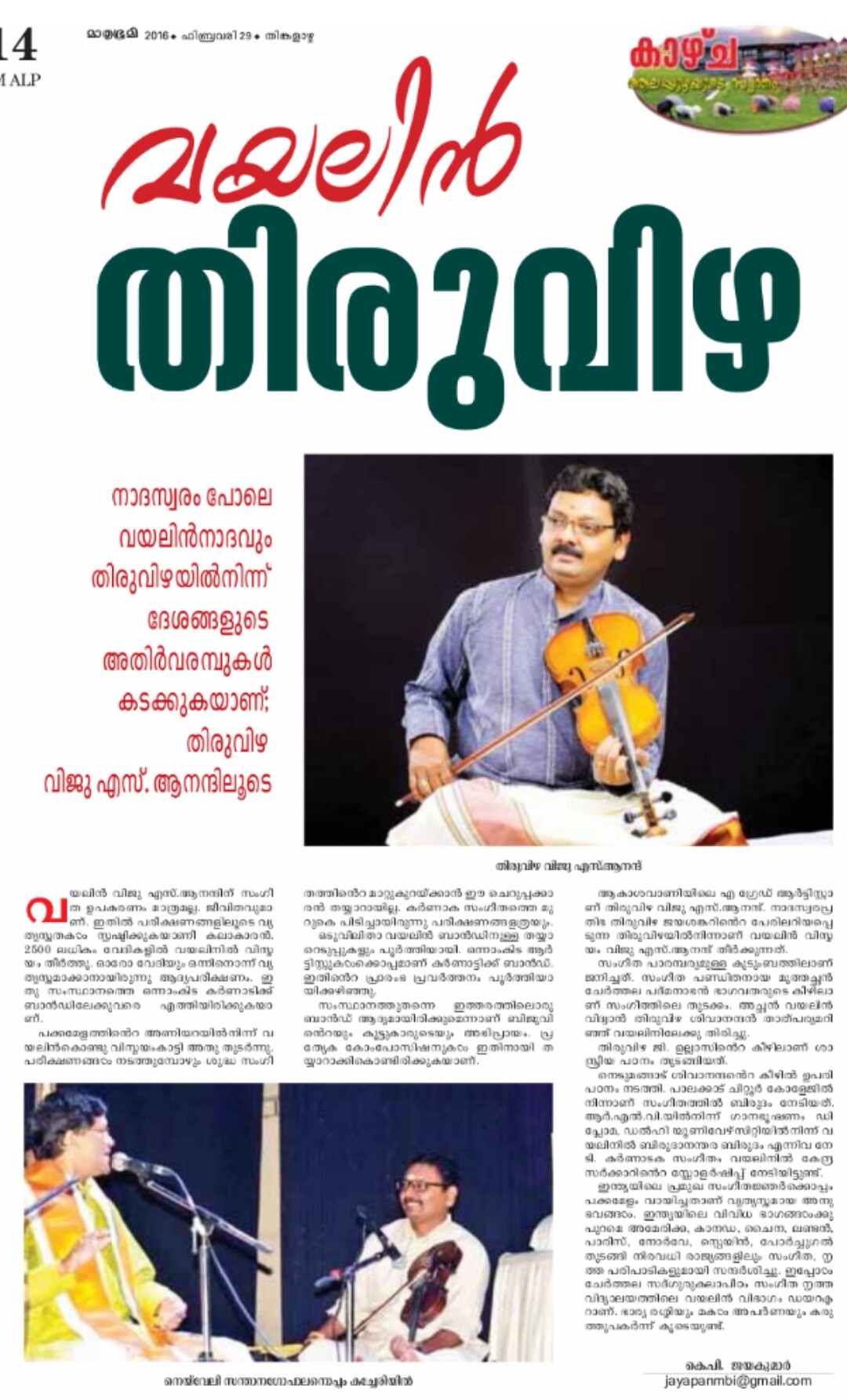 Viju S Anand attained his ‘ Ganabhooshanam’ Diploma with a meritorious first class from R.L.V College of Music, Thripunithura and he Graduated in Carnatic Music from Govt. Chittur College, Palakkad. Later on he completed his Masters in Violin (MA Music) with distinction from the Department of Music, University of Delhi.